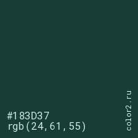 Цвет #183D37 в цветовой модели RGB обозначается тремя октетами (24, 61, 55) в десятичном формате и #183D37 в шестнадцатиричном (hex) формате, которые являются интенсивностью красного 24 (hex 18), интенсивность зелёного 61 (hex 3D) и интенсивность синего 55 (hex 37).