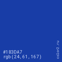 Цвет #183DA7 в цветовой модели RGB обозначается тремя октетами (24, 61, 167) в десятичном формате и #183DA7 в шестнадцатиричном (hex) формате, которые являются интенсивностью красного 24 (hex 18), интенсивность зелёного 61 (hex 3D) и интенсивность синего 167 (hex A7).