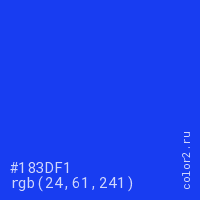 Цвет #183DF1 в цветовой модели RGB обозначается тремя октетами (24, 61, 241) в десятичном формате и #183DF1 в шестнадцатиричном (hex) формате, которые являются интенсивностью красного 24 (hex 18), интенсивность зелёного 61 (hex 3D) и интенсивность синего 241 (hex F1).