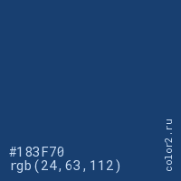 Цвет #183F70 в цветовой модели RGB обозначается тремя октетами (24, 63, 112) в десятичном формате и #183F70 в шестнадцатиричном (hex) формате, которые являются интенсивностью красного 24 (hex 18), интенсивность зелёного 63 (hex 3F) и интенсивность синего 112 (hex 70).