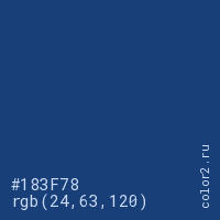 Цвет #183F78 в цветовой модели RGB обозначается тремя октетами (24, 63, 120) в десятичном формате и #183F78 в шестнадцатиричном (hex) формате, которые являются интенсивностью красного 24 (hex 18), интенсивность зелёного 63 (hex 3F) и интенсивность синего 120 (hex 78).