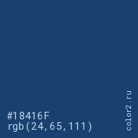 Цвет #18416F в цветовой модели RGB обозначается тремя октетами (24, 65, 111) в десятичном формате и #18416F в шестнадцатиричном (hex) формате, которые являются интенсивностью красного 24 (hex 18), интенсивность зелёного 65 (hex 41) и интенсивность синего 111 (hex 6F).
