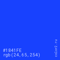 Цвет #1841FE в цветовой модели RGB обозначается тремя октетами (24, 65, 254) в десятичном формате и #1841FE в шестнадцатиричном (hex) формате, которые являются интенсивностью красного 24 (hex 18), интенсивность зелёного 65 (hex 41) и интенсивность синего 254 (hex FE).