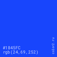 Цвет #1845FC в цветовой модели RGB обозначается тремя октетами (24, 69, 252) в десятичном формате и #1845FC в шестнадцатиричном (hex) формате, которые являются интенсивностью красного 24 (hex 18), интенсивность зелёного 69 (hex 45) и интенсивность синего 252 (hex FC).