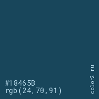 Цвет #18465B в цветовой модели RGB обозначается тремя октетами (24, 70, 91) в десятичном формате и #18465B в шестнадцатиричном (hex) формате, которые являются интенсивностью красного 24 (hex 18), интенсивность зелёного 70 (hex 46) и интенсивность синего 91 (hex 5B).