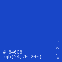 Цвет #1846C8 в цветовой модели RGB обозначается тремя октетами (24, 70, 200) в десятичном формате и #1846C8 в шестнадцатиричном (hex) формате, которые являются интенсивностью красного 24 (hex 18), интенсивность зелёного 70 (hex 46) и интенсивность синего 200 (hex C8).