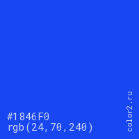 Цвет #1846F0 в цветовой модели RGB обозначается тремя октетами (24, 70, 240) в десятичном формате и #1846F0 в шестнадцатиричном (hex) формате, которые являются интенсивностью красного 24 (hex 18), интенсивность зелёного 70 (hex 46) и интенсивность синего 240 (hex F0).