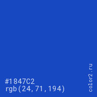 Цвет #1847C2 в цветовой модели RGB обозначается тремя октетами (24, 71, 194) в десятичном формате и #1847C2 в шестнадцатиричном (hex) формате, которые являются интенсивностью красного 24 (hex 18), интенсивность зелёного 71 (hex 47) и интенсивность синего 194 (hex C2).