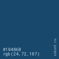 Цвет #18486B в цветовой модели RGB обозначается тремя октетами (24, 72, 107) в десятичном формате и #18486B в шестнадцатиричном (hex) формате, которые являются интенсивностью красного 24 (hex 18), интенсивность зелёного 72 (hex 48) и интенсивность синего 107 (hex 6B).