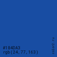 Цвет #184DA3 в цветовой модели RGB обозначается тремя октетами (24, 77, 163) в десятичном формате и #184DA3 в шестнадцатиричном (hex) формате, которые являются интенсивностью красного 24 (hex 18), интенсивность зелёного 77 (hex 4D) и интенсивность синего 163 (hex A3).