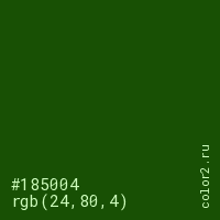 Цвет #185004 в цветовой модели RGB обозначается тремя октетами (24, 80, 4) в десятичном формате и #185004 в шестнадцатиричном (hex) формате, которые являются интенсивностью красного 24 (hex 18), интенсивность зелёного 80 (hex 50) и интенсивность синего 4 (hex 04).