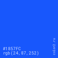 Цвет #1857FC в цветовой модели RGB обозначается тремя октетами (24, 87, 252) в десятичном формате и #1857FC в шестнадцатиричном (hex) формате, которые являются интенсивностью красного 24 (hex 18), интенсивность зелёного 87 (hex 57) и интенсивность синего 252 (hex FC).