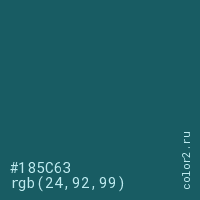 Цвет #185C63 в цветовой модели RGB обозначается тремя октетами (24, 92, 99) в десятичном формате и #185C63 в шестнадцатиричном (hex) формате, которые являются интенсивностью красного 24 (hex 18), интенсивность зелёного 92 (hex 5C) и интенсивность синего 99 (hex 63).