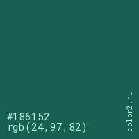 Цвет #186152 в цветовой модели RGB обозначается тремя октетами (24, 97, 82) в десятичном формате и #186152 в шестнадцатиричном (hex) формате, которые являются интенсивностью красного 24 (hex 18), интенсивность зелёного 97 (hex 61) и интенсивность синего 82 (hex 52).