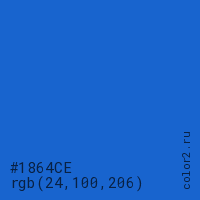 Цвет #1864CE в цветовой модели RGB обозначается тремя октетами (24, 100, 206) в десятичном формате и #1864CE в шестнадцатиричном (hex) формате, которые являются интенсивностью красного 24 (hex 18), интенсивность зелёного 100 (hex 64) и интенсивность синего 206 (hex CE).