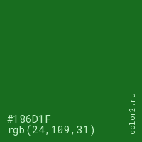 Цвет #186D1F в цветовой модели RGB обозначается тремя октетами (24, 109, 31) в десятичном формате и #186D1F в шестнадцатиричном (hex) формате, которые являются интенсивностью красного 24 (hex 18), интенсивность зелёного 109 (hex 6D) и интенсивность синего 31 (hex 1F).
