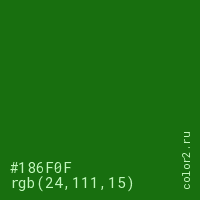 Цвет #186F0F в цветовой модели RGB обозначается тремя октетами (24, 111, 15) в десятичном формате и #186F0F в шестнадцатиричном (hex) формате, которые являются интенсивностью красного 24 (hex 18), интенсивность зелёного 111 (hex 6F) и интенсивность синего 15 (hex 0F).
