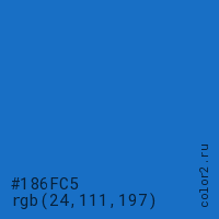 Цвет #186FC5 в цветовой модели RGB обозначается тремя октетами (24, 111, 197) в десятичном формате и #186FC5 в шестнадцатиричном (hex) формате, которые являются интенсивностью красного 24 (hex 18), интенсивность зелёного 111 (hex 6F) и интенсивность синего 197 (hex C5).