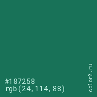 Цвет #187258 в цветовой модели RGB обозначается тремя октетами (24, 114, 88) в десятичном формате и #187258 в шестнадцатиричном (hex) формате, которые являются интенсивностью красного 24 (hex 18), интенсивность зелёного 114 (hex 72) и интенсивность синего 88 (hex 58).