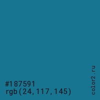Цвет #187591 в цветовой модели RGB обозначается тремя октетами (24, 117, 145) в десятичном формате и #187591 в шестнадцатиричном (hex) формате, которые являются интенсивностью красного 24 (hex 18), интенсивность зелёного 117 (hex 75) и интенсивность синего 145 (hex 91).