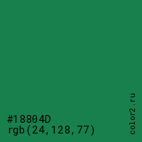 Цвет #18804D в цветовой модели RGB обозначается тремя октетами (24, 128, 77) в десятичном формате и #18804D в шестнадцатиричном (hex) формате, которые являются интенсивностью красного 24 (hex 18), интенсивность зелёного 128 (hex 80) и интенсивность синего 77 (hex 4D).