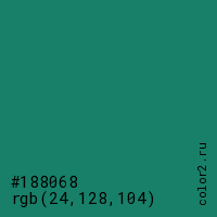 Цвет #188068 в цветовой модели RGB обозначается тремя октетами (24, 128, 104) в десятичном формате и #188068 в шестнадцатиричном (hex) формате, которые являются интенсивностью красного 24 (hex 18), интенсивность зелёного 128 (hex 80) и интенсивность синего 104 (hex 68).