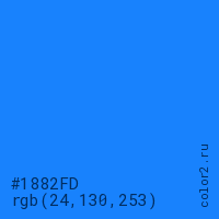 Цвет #1882FD в цветовой модели RGB обозначается тремя октетами (24, 130, 253) в десятичном формате и #1882FD в шестнадцатиричном (hex) формате, которые являются интенсивностью красного 24 (hex 18), интенсивность зелёного 130 (hex 82) и интенсивность синего 253 (hex FD).