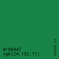 Цвет #188447 в цветовой модели RGB обозначается тремя октетами (24, 132, 71) в десятичном формате и #188447 в шестнадцатиричном (hex) формате, которые являются интенсивностью красного 24 (hex 18), интенсивность зелёного 132 (hex 84) и интенсивность синего 71 (hex 47).