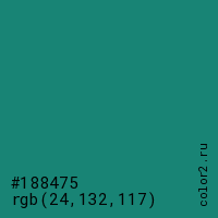 Цвет #188475 в цветовой модели RGB обозначается тремя октетами (24, 132, 117) в десятичном формате и #188475 в шестнадцатиричном (hex) формате, которые являются интенсивностью красного 24 (hex 18), интенсивность зелёного 132 (hex 84) и интенсивность синего 117 (hex 75).