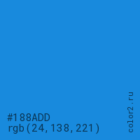 Цвет #188ADD в цветовой модели RGB обозначается тремя октетами (24, 138, 221) в десятичном формате и #188ADD в шестнадцатиричном (hex) формате, которые являются интенсивностью красного 24 (hex 18), интенсивность зелёного 138 (hex 8A) и интенсивность синего 221 (hex DD).