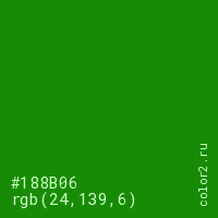 Цвет #188B06 в цветовой модели RGB обозначается тремя октетами (24, 139, 6) в десятичном формате и #188B06 в шестнадцатиричном (hex) формате, которые являются интенсивностью красного 24 (hex 18), интенсивность зелёного 139 (hex 8B) и интенсивность синего 6 (hex 06).
