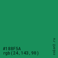 Цвет #188F5A в цветовой модели RGB обозначается тремя октетами (24, 143, 90) в десятичном формате и #188F5A в шестнадцатиричном (hex) формате, которые являются интенсивностью красного 24 (hex 18), интенсивность зелёного 143 (hex 8F) и интенсивность синего 90 (hex 5A).