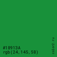 Цвет #18913A в цветовой модели RGB обозначается тремя октетами (24, 145, 58) в десятичном формате и #18913A в шестнадцатиричном (hex) формате, которые являются интенсивностью красного 24 (hex 18), интенсивность зелёного 145 (hex 91) и интенсивность синего 58 (hex 3A).