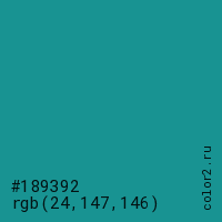 Цвет #189392 в цветовой модели RGB обозначается тремя октетами (24, 147, 146) в десятичном формате и #189392 в шестнадцатиричном (hex) формате, которые являются интенсивностью красного 24 (hex 18), интенсивность зелёного 147 (hex 93) и интенсивность синего 146 (hex 92).
