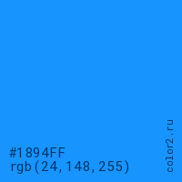 Цвет #1894FF в цветовой модели RGB обозначается тремя октетами (24, 148, 255) в десятичном формате и #1894FF в шестнадцатиричном (hex) формате, которые являются интенсивностью красного 24 (hex 18), интенсивность зелёного 148 (hex 94) и интенсивность синего 255 (hex FF).