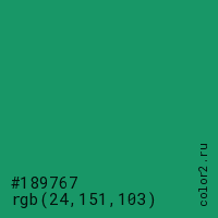 Цвет #189767 в цветовой модели RGB обозначается тремя октетами (24, 151, 103) в десятичном формате и #189767 в шестнадцатиричном (hex) формате, которые являются интенсивностью красного 24 (hex 18), интенсивность зелёного 151 (hex 97) и интенсивность синего 103 (hex 67).