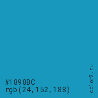 Цвет #1898BC в цветовой модели RGB обозначается тремя октетами (24, 152, 188) в десятичном формате и #1898BC в шестнадцатиричном (hex) формате, которые являются интенсивностью красного 24 (hex 18), интенсивность зелёного 152 (hex 98) и интенсивность синего 188 (hex BC).