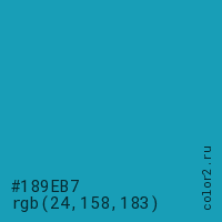 Цвет #189EB7 в цветовой модели RGB обозначается тремя октетами (24, 158, 183) в десятичном формате и #189EB7 в шестнадцатиричном (hex) формате, которые являются интенсивностью красного 24 (hex 18), интенсивность зелёного 158 (hex 9E) и интенсивность синего 183 (hex B7).