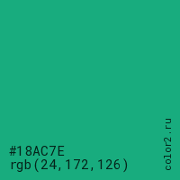 Цвет #18AC7E в цветовой модели RGB обозначается тремя октетами (24, 172, 126) в десятичном формате и #18AC7E в шестнадцатиричном (hex) формате, которые являются интенсивностью красного 24 (hex 18), интенсивность зелёного 172 (hex AC) и интенсивность синего 126 (hex 7E).