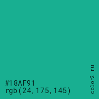 Цвет #18AF91 в цветовой модели RGB обозначается тремя октетами (24, 175, 145) в десятичном формате и #18AF91 в шестнадцатиричном (hex) формате, которые являются интенсивностью красного 24 (hex 18), интенсивность зелёного 175 (hex AF) и интенсивность синего 145 (hex 91).