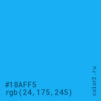 Цвет #18AFF5 в цветовой модели RGB обозначается тремя октетами (24, 175, 245) в десятичном формате и #18AFF5 в шестнадцатиричном (hex) формате, которые являются интенсивностью красного 24 (hex 18), интенсивность зелёного 175 (hex AF) и интенсивность синего 245 (hex F5).