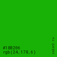 Цвет #18B206 в цветовой модели RGB обозначается тремя октетами (24, 178, 6) в десятичном формате и #18B206 в шестнадцатиричном (hex) формате, которые являются интенсивностью красного 24 (hex 18), интенсивность зелёного 178 (hex B2) и интенсивность синего 6 (hex 06).