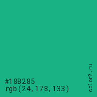 Цвет #18B285 в цветовой модели RGB обозначается тремя октетами (24, 178, 133) в десятичном формате и #18B285 в шестнадцатиричном (hex) формате, которые являются интенсивностью красного 24 (hex 18), интенсивность зелёного 178 (hex B2) и интенсивность синего 133 (hex 85).