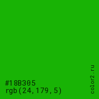 Цвет #18B305 в цветовой модели RGB обозначается тремя октетами (24, 179, 5) в десятичном формате и #18B305 в шестнадцатиричном (hex) формате, которые являются интенсивностью красного 24 (hex 18), интенсивность зелёного 179 (hex B3) и интенсивность синего 5 (hex 05).