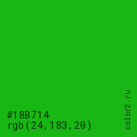 Цвет #18B714 в цветовой модели RGB обозначается тремя октетами (24, 183, 20) в десятичном формате и #18B714 в шестнадцатиричном (hex) формате, которые являются интенсивностью красного 24 (hex 18), интенсивность зелёного 183 (hex B7) и интенсивность синего 20 (hex 14).