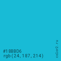 Цвет #18BBD6 в цветовой модели RGB обозначается тремя октетами (24, 187, 214) в десятичном формате и #18BBD6 в шестнадцатиричном (hex) формате, которые являются интенсивностью красного 24 (hex 18), интенсивность зелёного 187 (hex BB) и интенсивность синего 214 (hex D6).