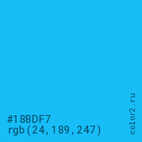 Цвет #18BDF7 в цветовой модели RGB обозначается тремя октетами (24, 189, 247) в десятичном формате и #18BDF7 в шестнадцатиричном (hex) формате, которые являются интенсивностью красного 24 (hex 18), интенсивность зелёного 189 (hex BD) и интенсивность синего 247 (hex F7).