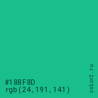 Цвет #18BF8D в цветовой модели RGB обозначается тремя октетами (24, 191, 141) в десятичном формате и #18BF8D в шестнадцатиричном (hex) формате, которые являются интенсивностью красного 24 (hex 18), интенсивность зелёного 191 (hex BF) и интенсивность синего 141 (hex 8D).