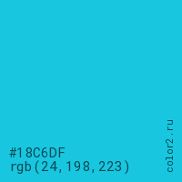 Цвет #18C6DF в цветовой модели RGB обозначается тремя октетами (24, 198, 223) в десятичном формате и #18C6DF в шестнадцатиричном (hex) формате, которые являются интенсивностью красного 24 (hex 18), интенсивность зелёного 198 (hex C6) и интенсивность синего 223 (hex DF).