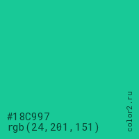 Цвет #18C997 в цветовой модели RGB обозначается тремя октетами (24, 201, 151) в десятичном формате и #18C997 в шестнадцатиричном (hex) формате, которые являются интенсивностью красного 24 (hex 18), интенсивность зелёного 201 (hex C9) и интенсивность синего 151 (hex 97).